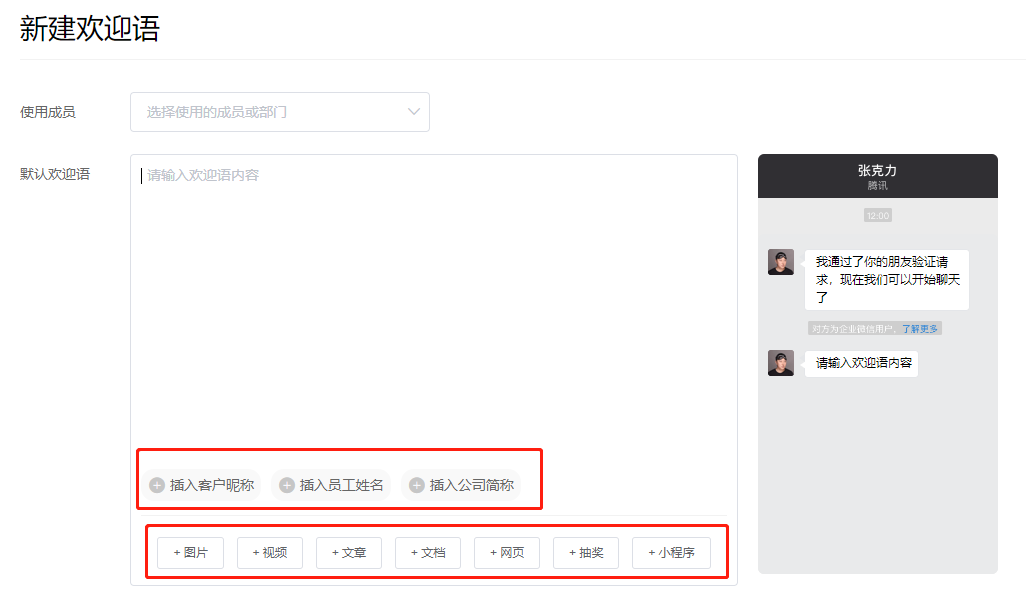 欢迎语支持插入客户昵称、员工姓名、公司简称等参数,同时也支持插入图片、视频、文章、文档、网页、小程序消息等附件。