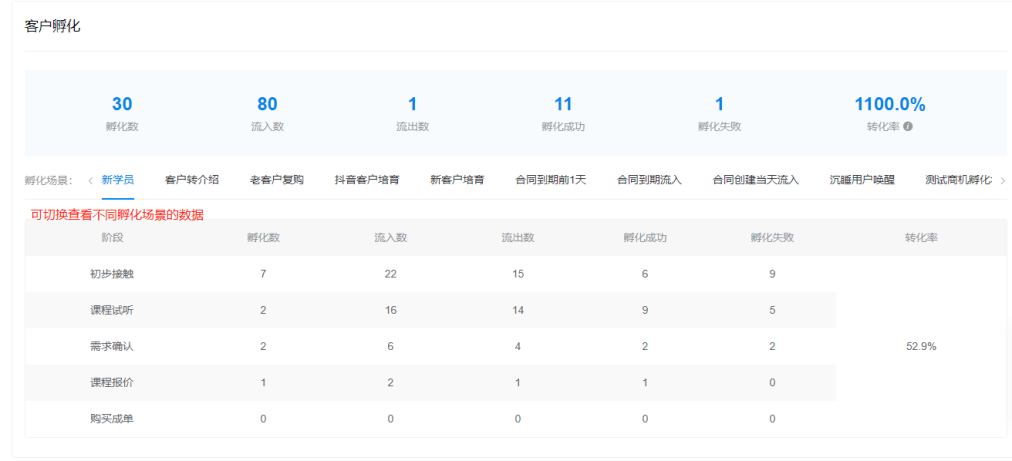 企业客户成百上千,在不同客户孵化分组通过智能SOP进行转化。通过数据看板,客户孵化总数、流入流出数、孵化成功数、转化率一目了然。还可以针对某一孵化场景,查看各个SOP阶段的孵化数据。数据维度更精细,企业管理更高效。