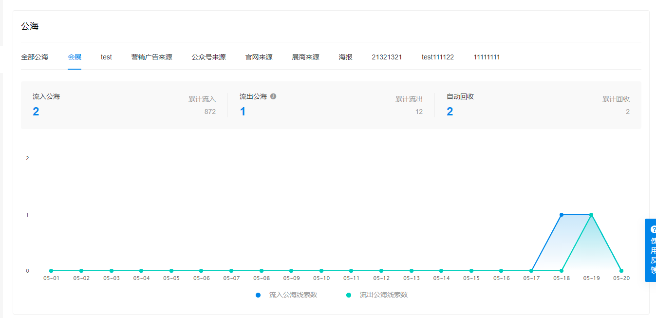 分类展示不同公海的数据,每日公海线索变动一目了然。通过数据,管理员能了解不同渠道的线索情况,帮助企业挖掘最有效的线索获取渠道。