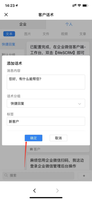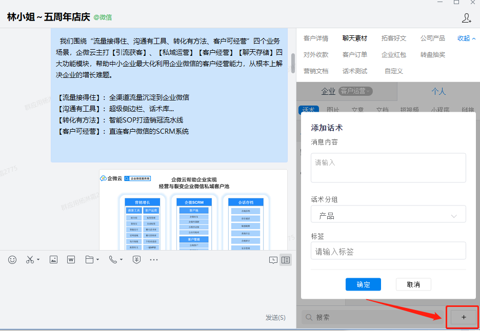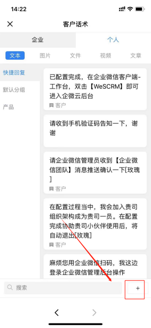 在企业微信客户端或手机端,进入客户话术,点击右下角“+”,添加话术内容。