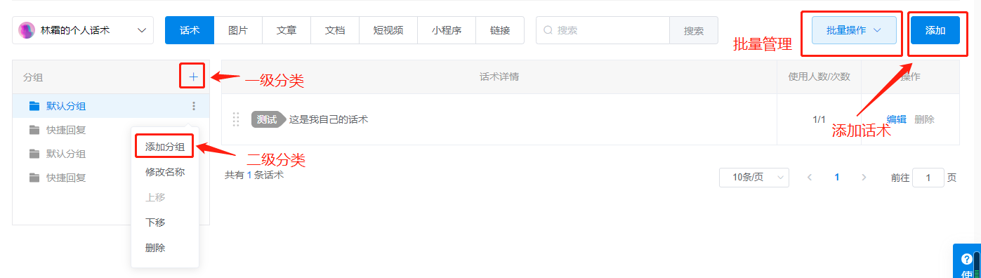 聊天素材分为企业话术和个人话术。企业话术库由企业统一上传,个人话术库由员工自己管理。可根据部门使用设置多个话术套账,还可二级分类,快速查找。