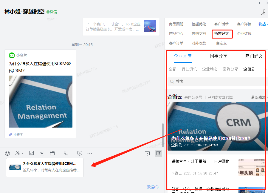 此外企业还可以将公众号文章同步到WeSCRM企微云【拓客好文】,也可自行上传优质文章。销售人员可通过企业微信聊天侧边栏将优质文章分享给客户,不仅能打造销售专业形象,还能通过文章与客户建立话题,持续互动。