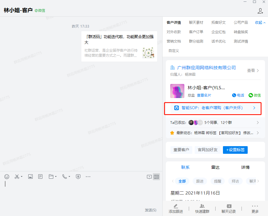 方式一:在企业微信客户端,点击聊天侧边栏【客户详情】-【智能SOP】