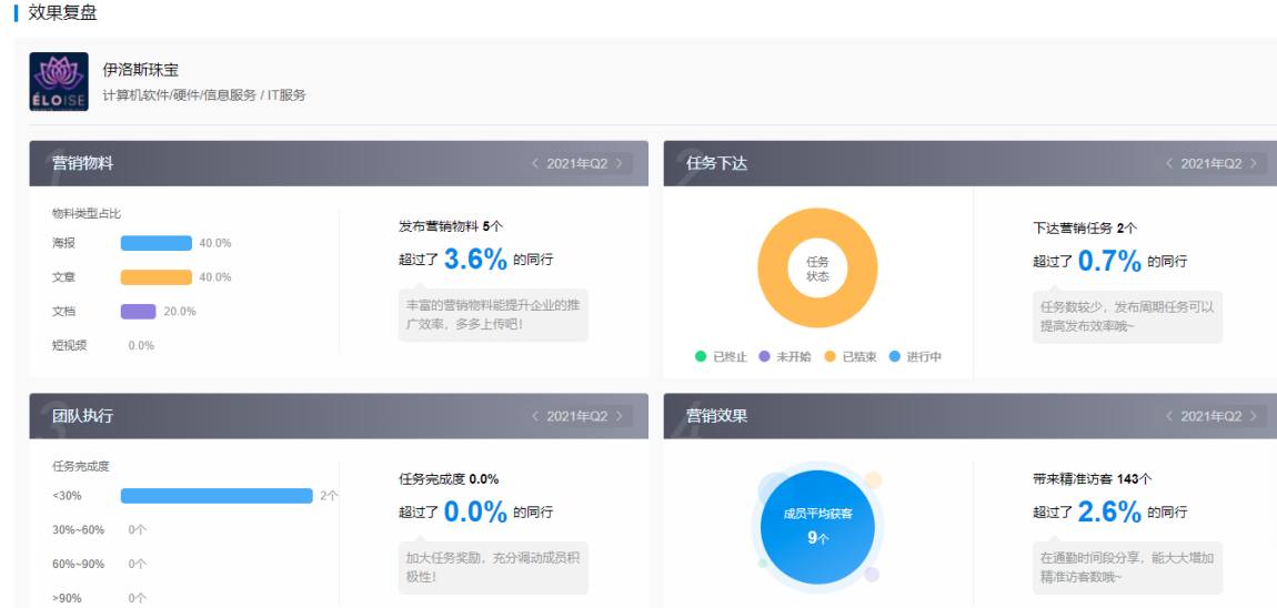 【效果复盘】支持结合同行业营销效果进行复盘,对营销物料发放数据、营销任务下达情况、成员执行情况、获客效果等数据进行对比。