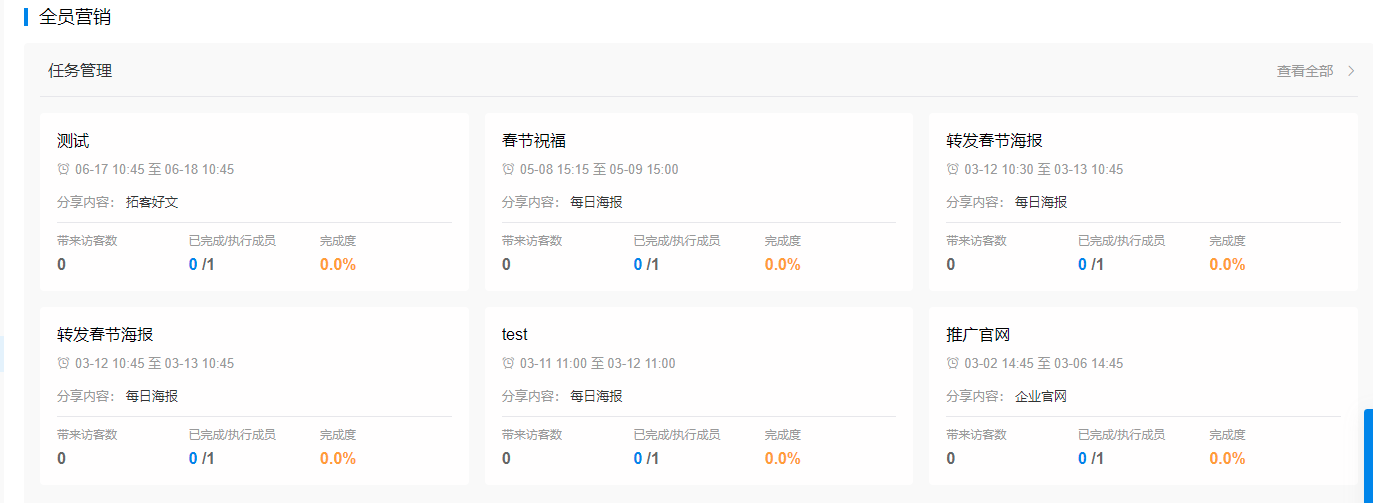 【全员营销】可查看全员营销任务情况,包括分享内容、推广时间、访客数、执行情况等。
