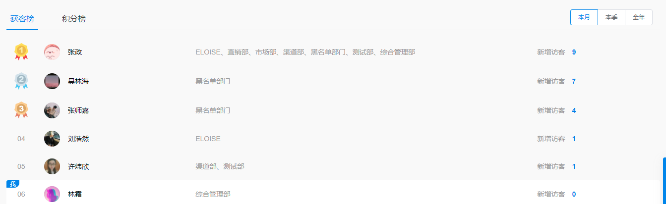 【积分榜/获客榜】按周、月、季度智能统计成员营销获客排行榜和积分榜。