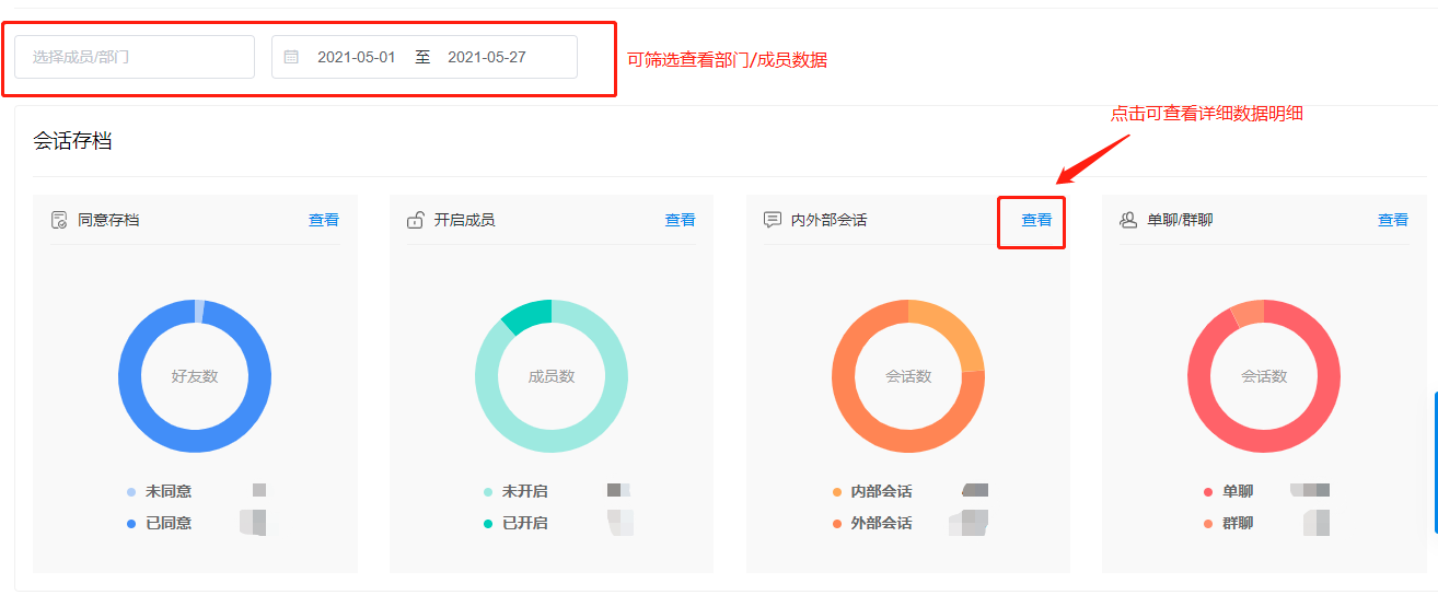 【会话存档统计】:有多少客户同意会话存档、内外消息数多少、主要会话发送在单聊还是群聊?在聊天存储数据分析即可知晓,帮助企业掌握会话存储基本情况。