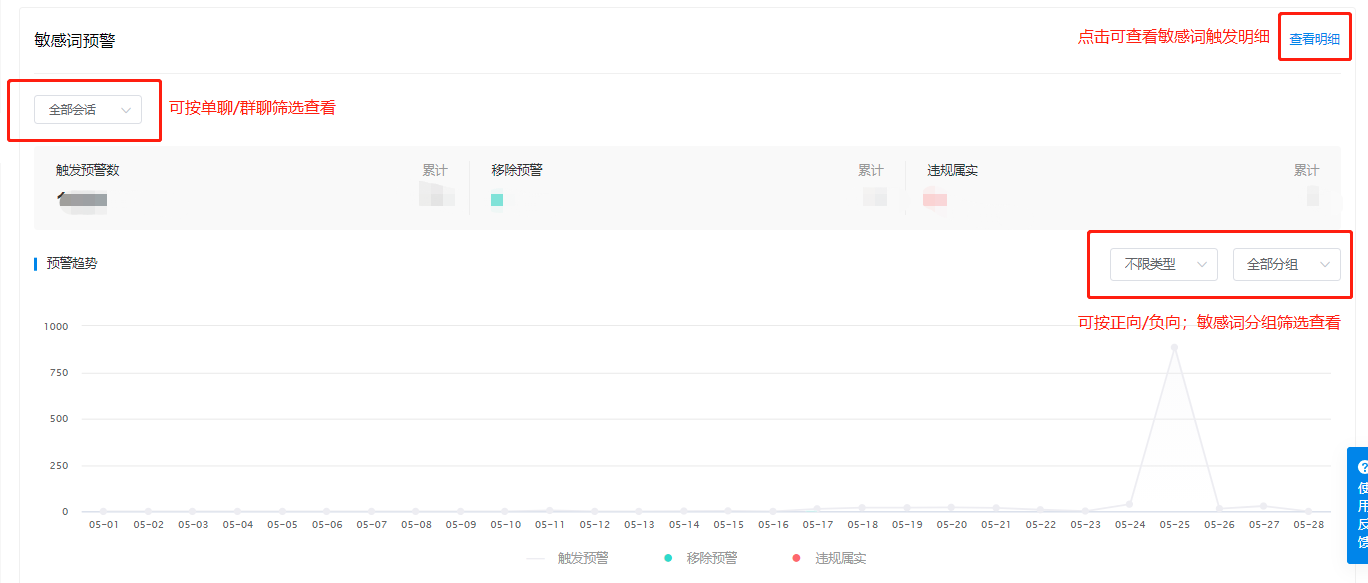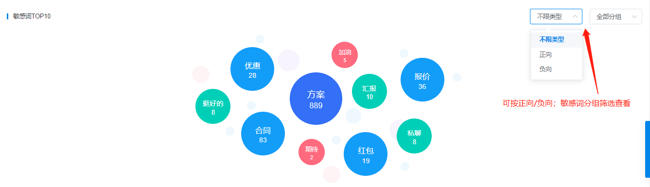 【敏感词预警统计】:敏感词预警能帮助企业规避风险,但并无数据能帮助企业掌握敏感词触发的情况。数据分析-聊天存储,统计了正向和负向敏感词触发情况,帮助企业掌握敏感词情况。