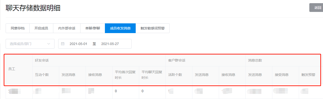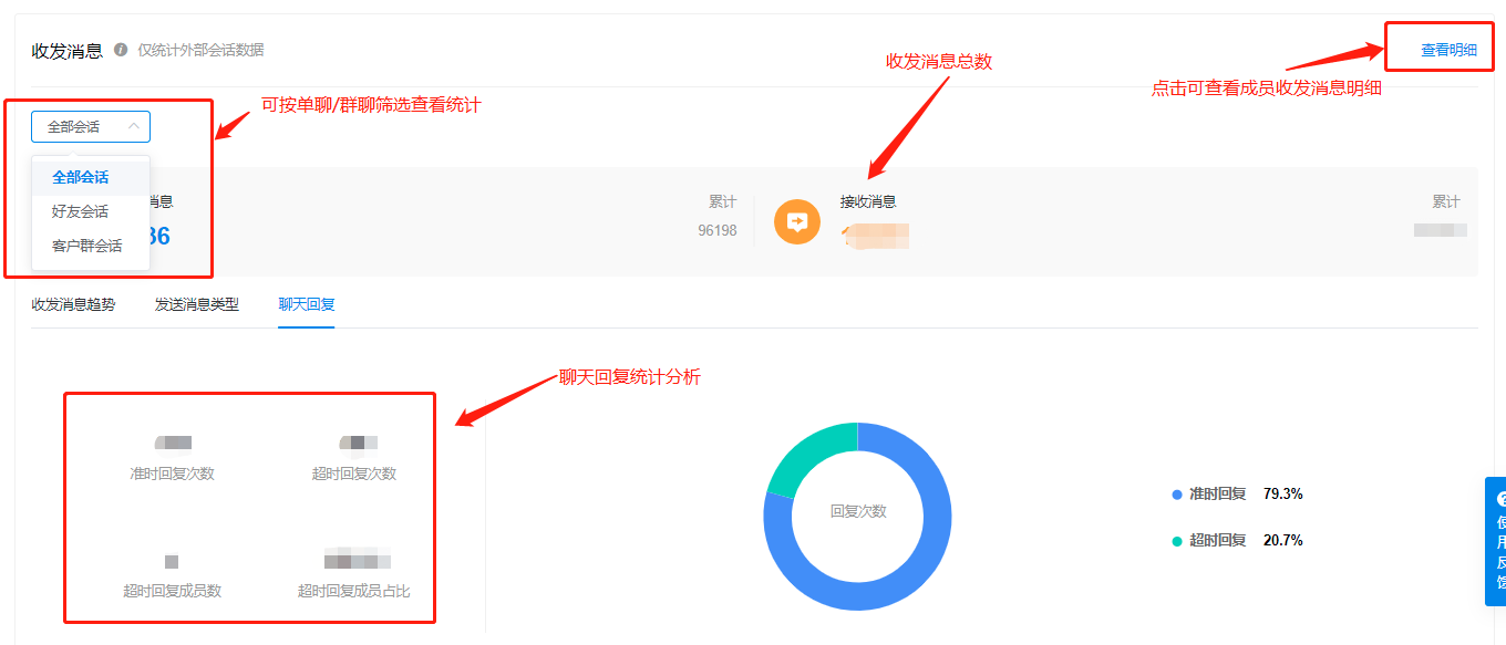 【收发消息数统计】:成员每日有无积极对接客户,回复质效如何?收发消息统计即可辅助管理员掌握。