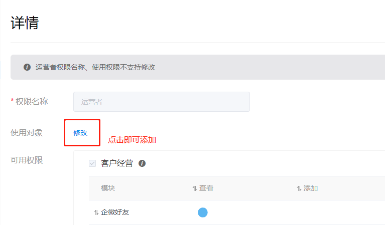 操作路径:WeSCRM企微云后台-系统设置-企业管理-角色权限-运营者,点击查看,便可添加运营者的使用对象