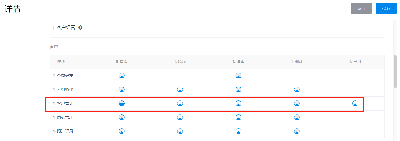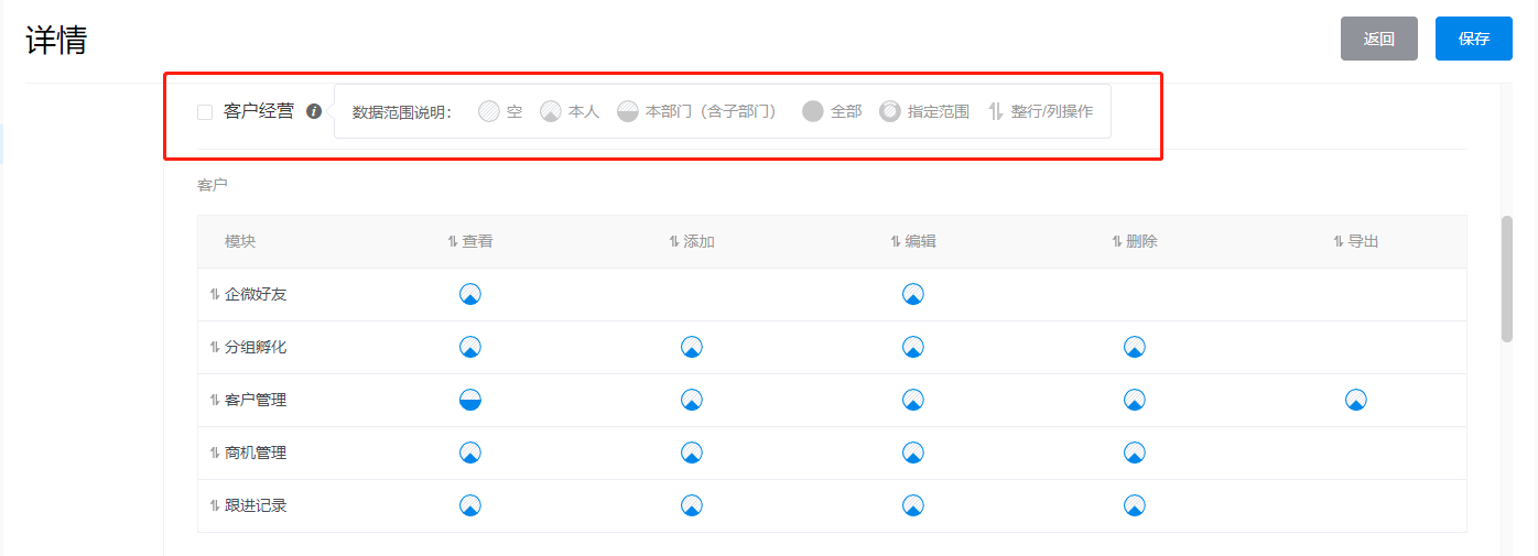 我们在客户管理模块的“查看”权限选择本部门;“添加”、“编辑”、“删除”选择本人;“导出”选择空。则对应的权限管理效果为:使用了该角色的成员,在客户管理模块可以查看自己所在的部门(含子部门及本人)的客户,只能编辑、添加、删除自己的客户,不能做导出操作。
