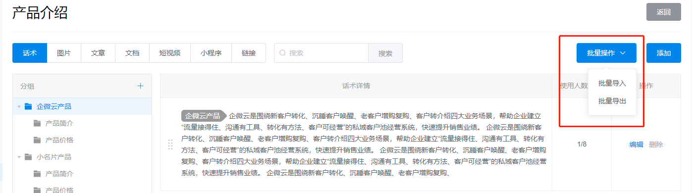 ④批量导入/导出话术:文本类话术,支持批量导入或者导出。点击批量导出,系统将自动将话术库下载为表格。下载文件模板后,将需要导入的话术录入模板中即可进行批量导入。