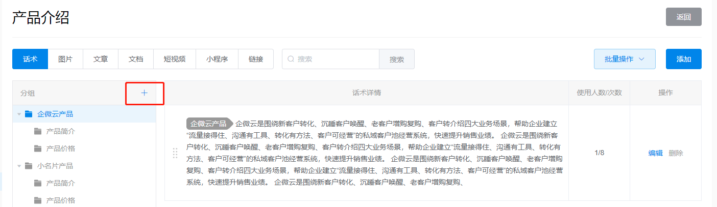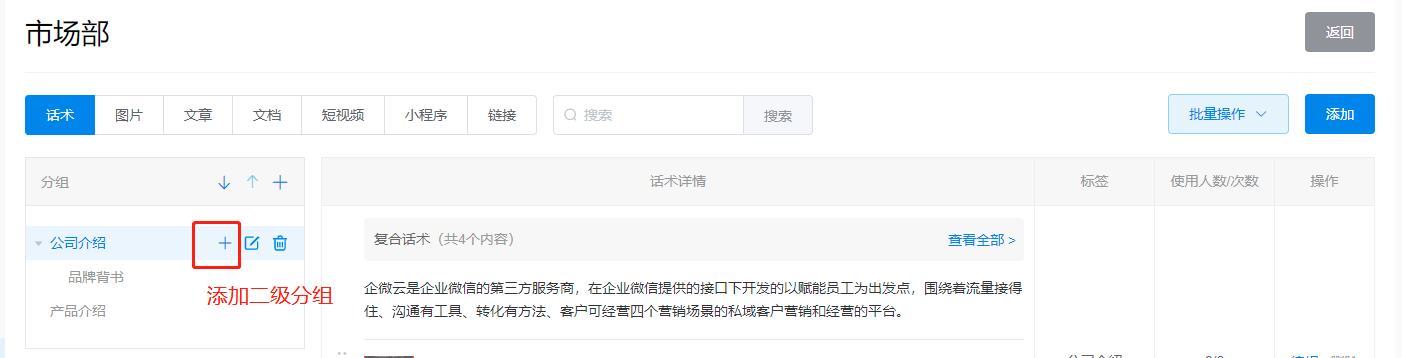 ②添加话术分组:创建话术分组,方便企业成员在使用时快速按照分类找到对应话术,这里以添加文本话术为例。点击分组右上角“+”,添加分组