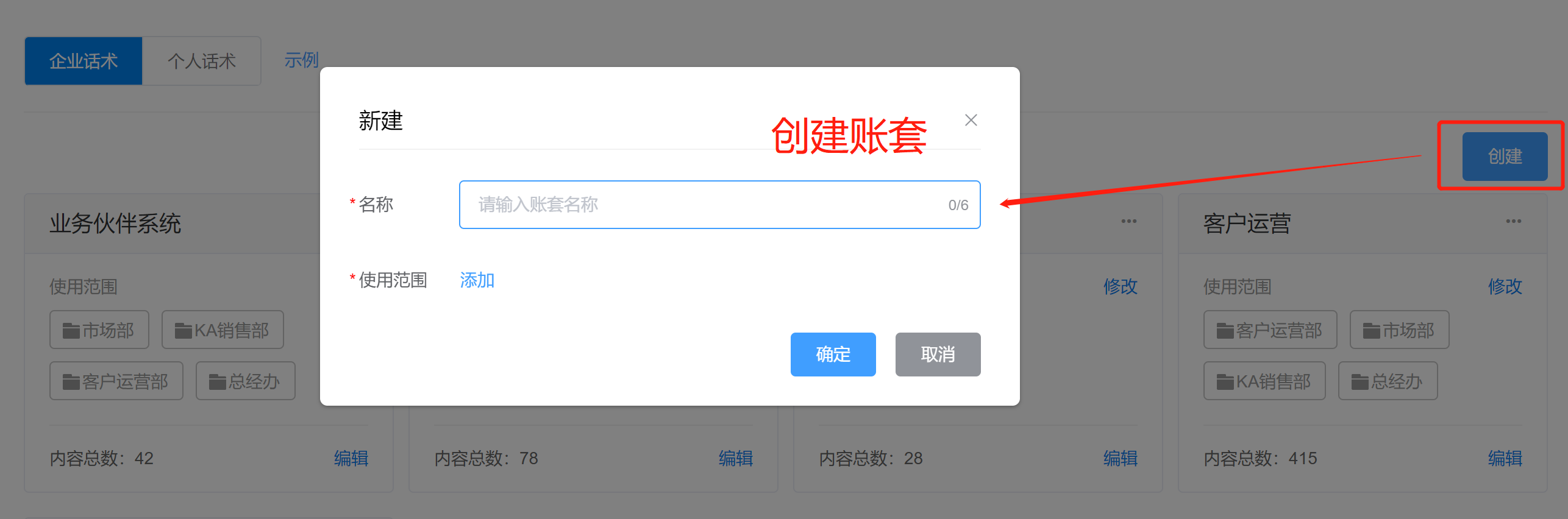 ①创建话术库套账:企业可根据实际情况,创建多个话术库套账,每个话术库可开启不同的试使用范围。