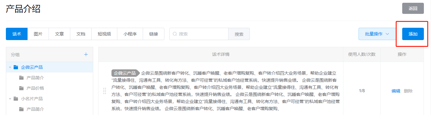 WeSCRM企微云话术库支持二级分组,满足企业复杂的话术使用场景,比如产品分组下可分为“产品A”和“产品B”两个分组。