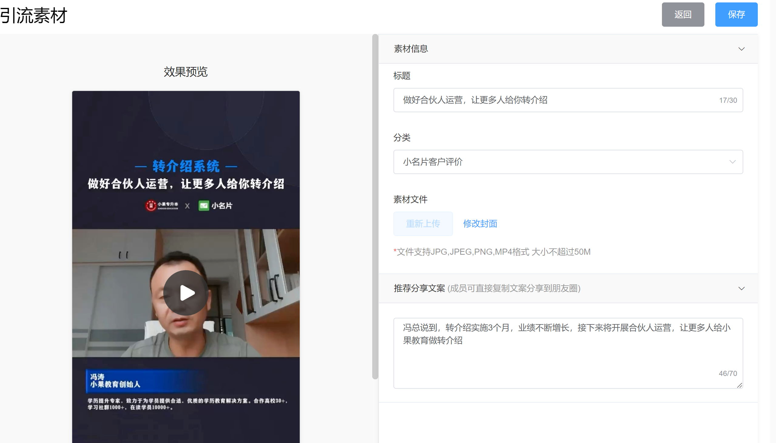 ②上传素材:引流素材支持上传海报或者短视频,素材上传后,设置标题、分享文案等内容后,保存即可
