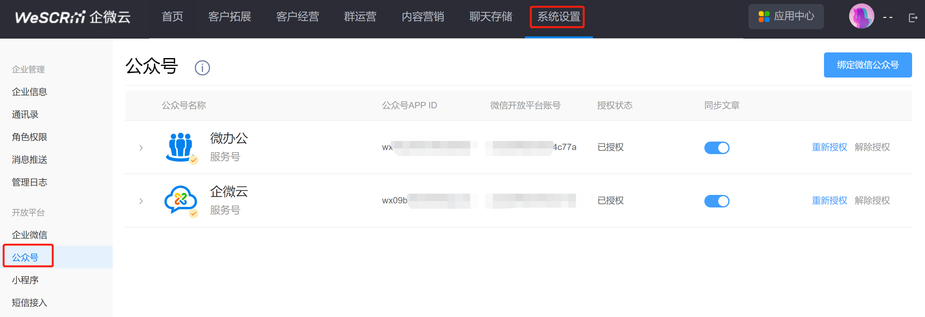 操作路径:WeSCRM企微云后台-系统设置-开放平台-公众号