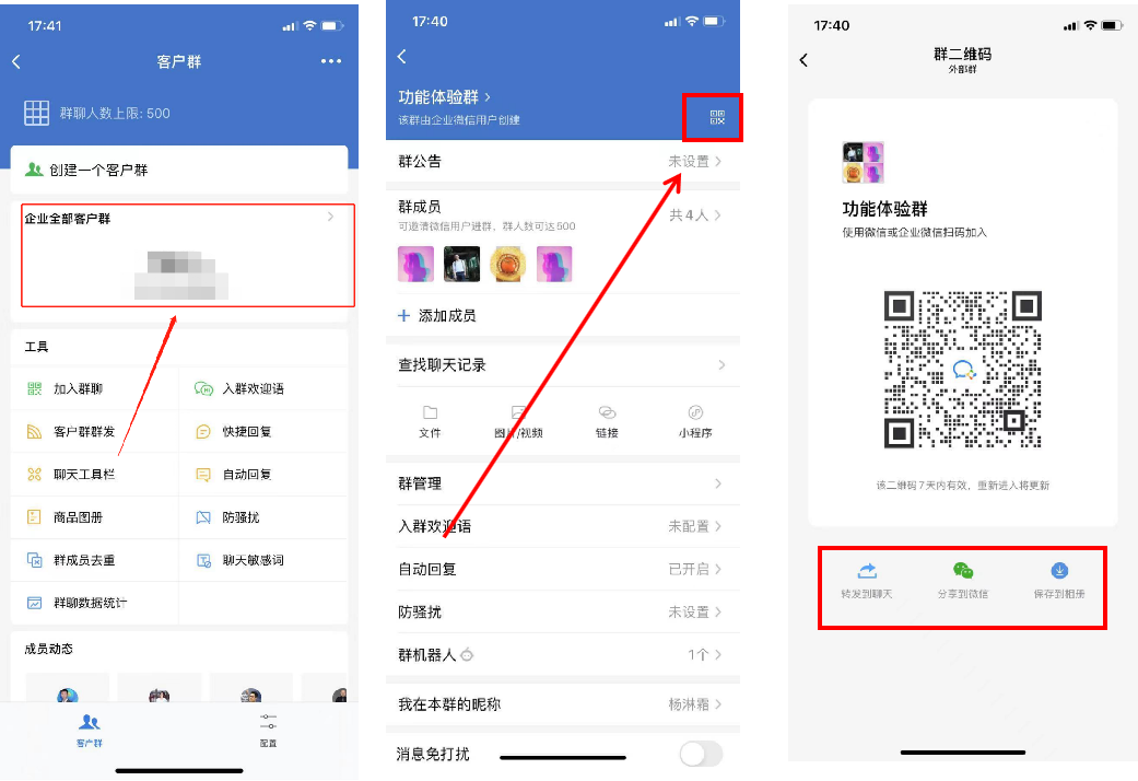 方式二:在企业微信手机端或客户端,点击【工作台】-【客户群】,查看客户群,选择要下载群二维码的群聊,点击右上角二维码图标,保存即可。