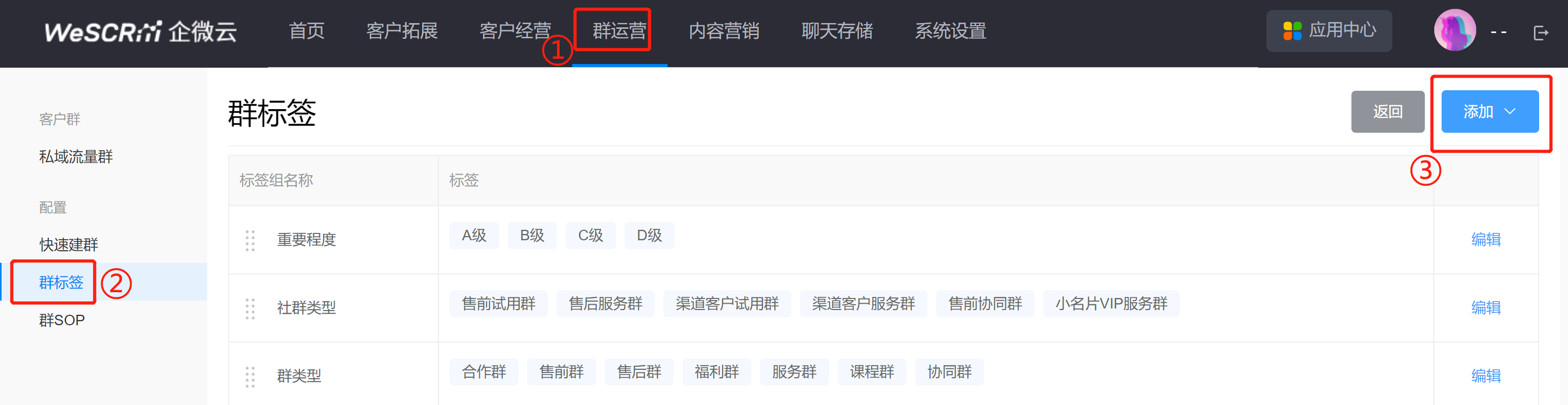 具体操作:点击WeSCRM企微云后台-【群运营】-【配置】-【群标签】,即可设置群标签。