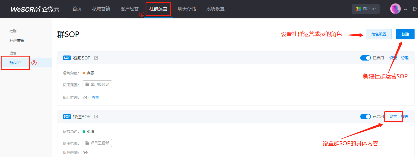 操作路径:WeSCRM企微云后台-社群运营-运营-群SOP