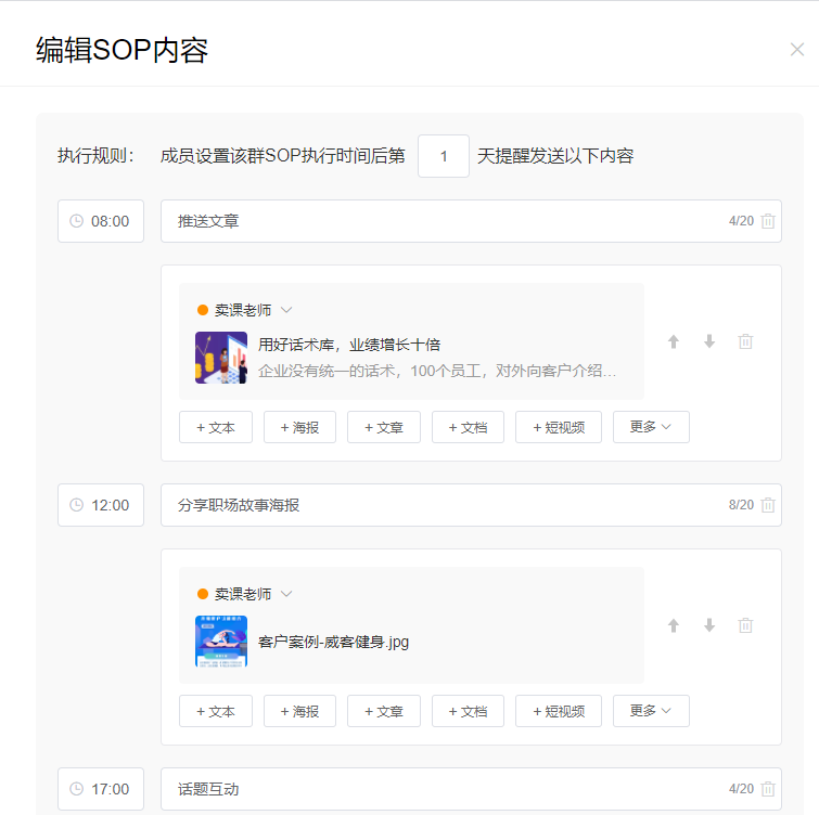 配置社群运营SOP后,可以通过群SOP将企业的社群运营工作标准化,帮助企业统一运营节奏和内容,赋能运营人员,提高社群运营效率和转化率。