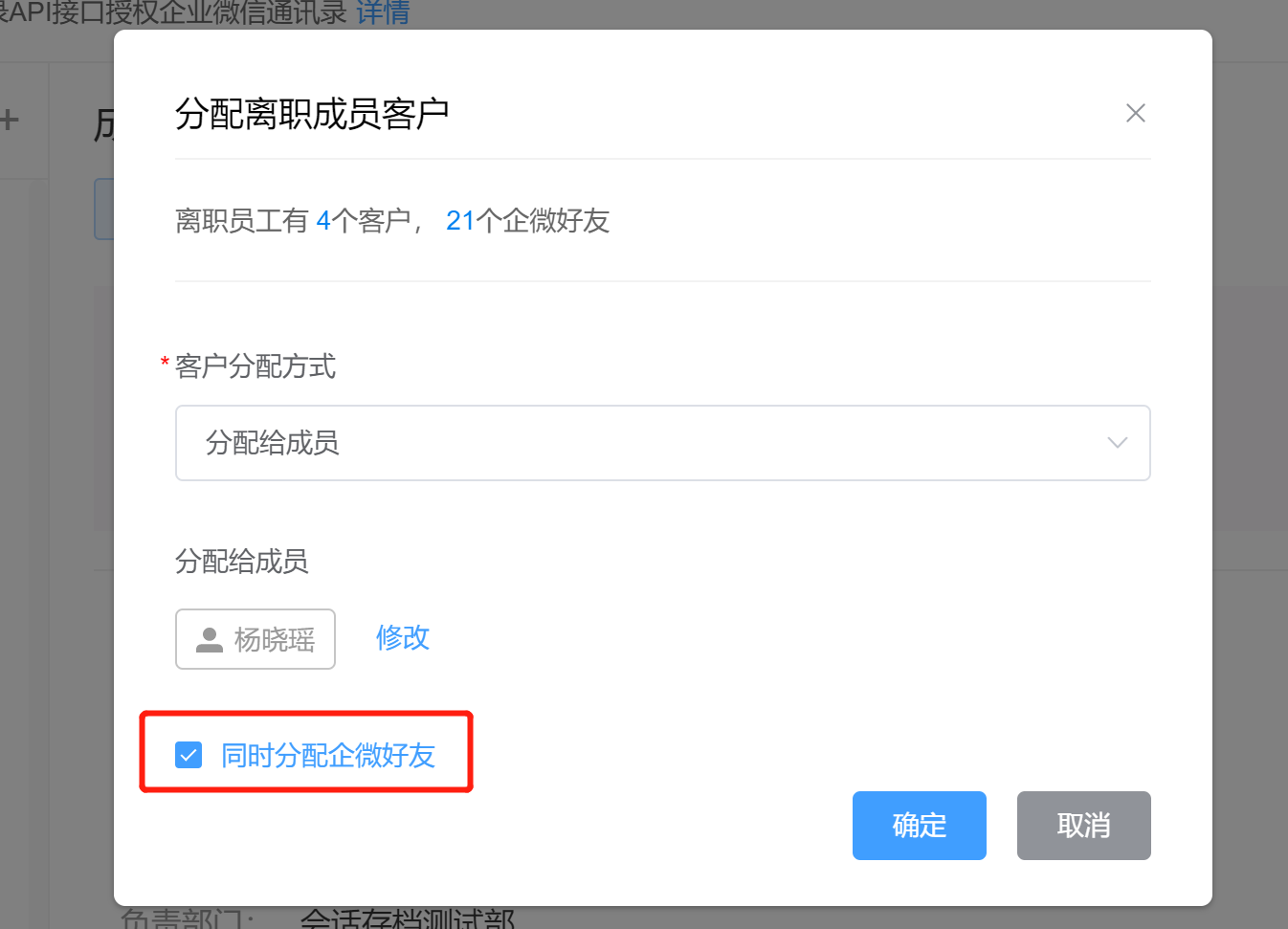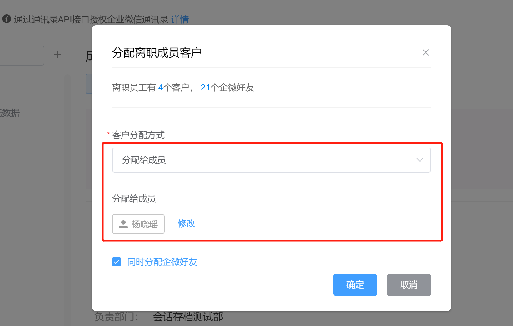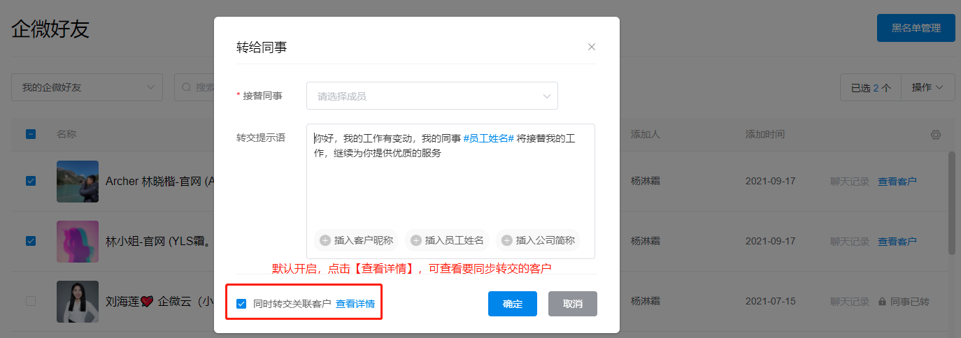 ③如果勾选了“同时分配企微好友”,则客户的好友关系和客户档案会在24小时后一并转交给在职同事。