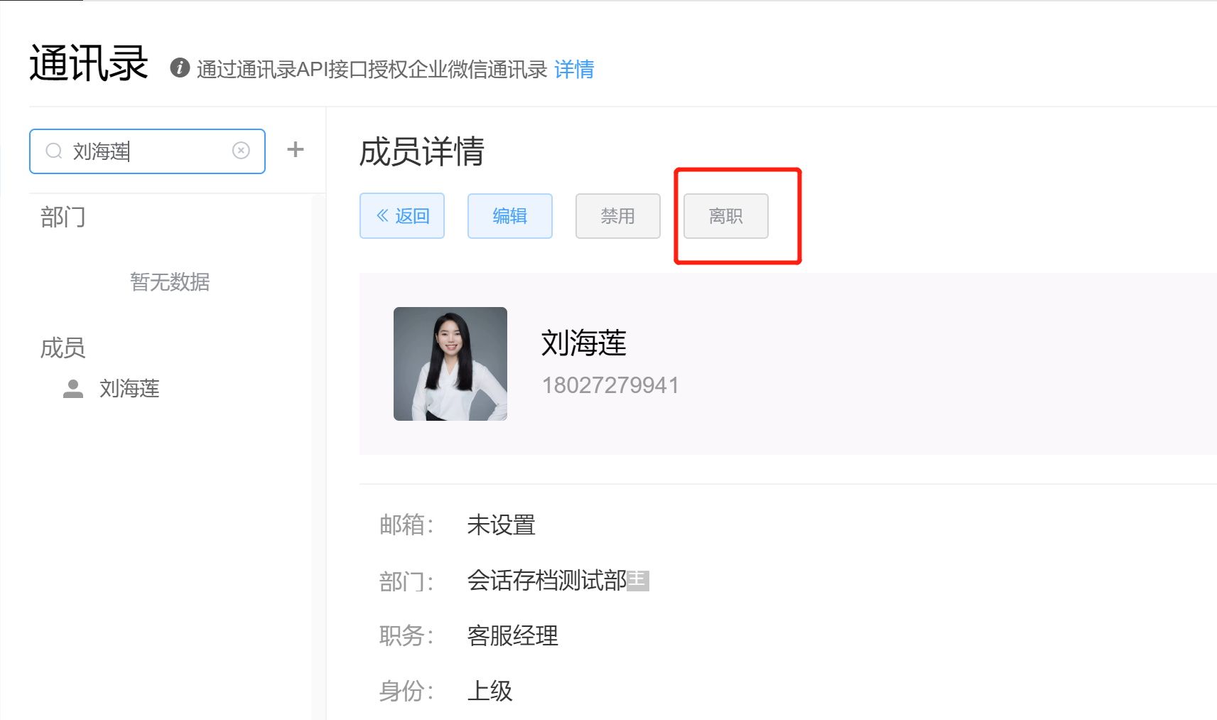 ①在企微云后台-【系统设置】-【通讯录】,找到要离职的同事,点击【离职】。