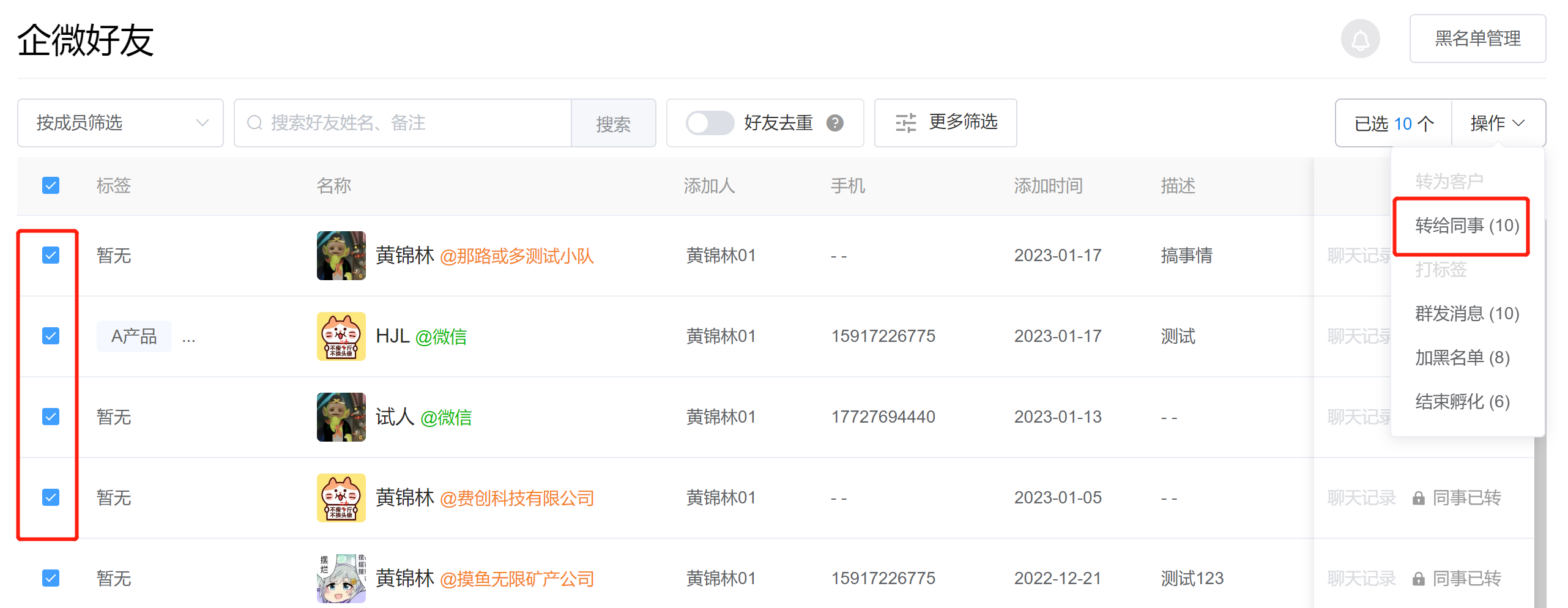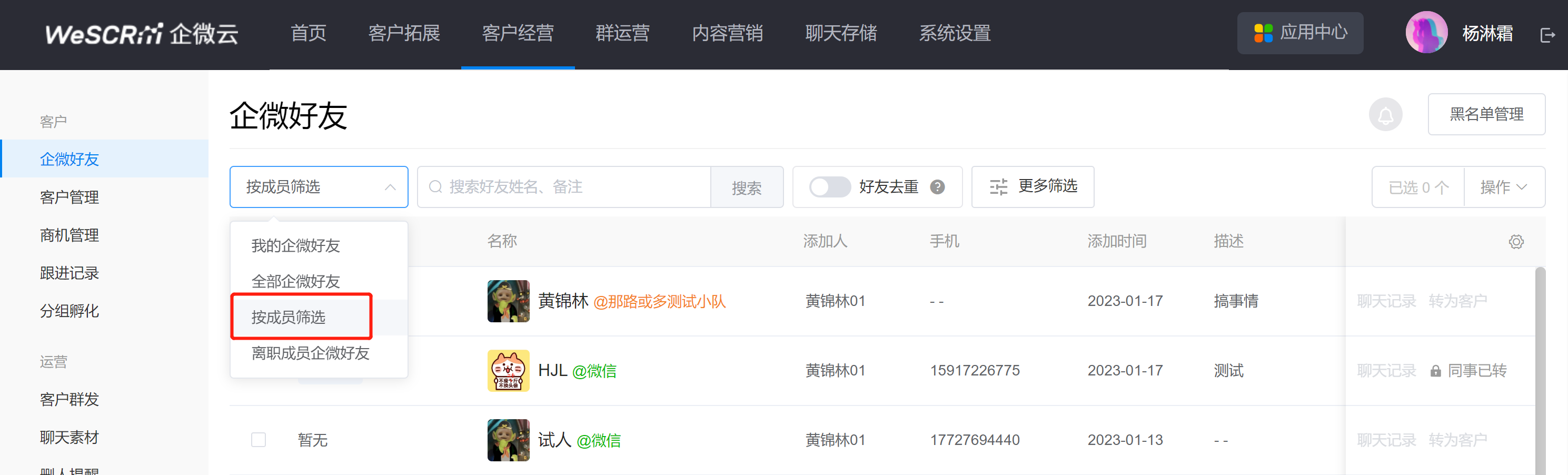 ①管理员在企微云后台,进入【企微好友】管理页面。点击顶部选择【按成员筛选】,选择要转交客户的成员。