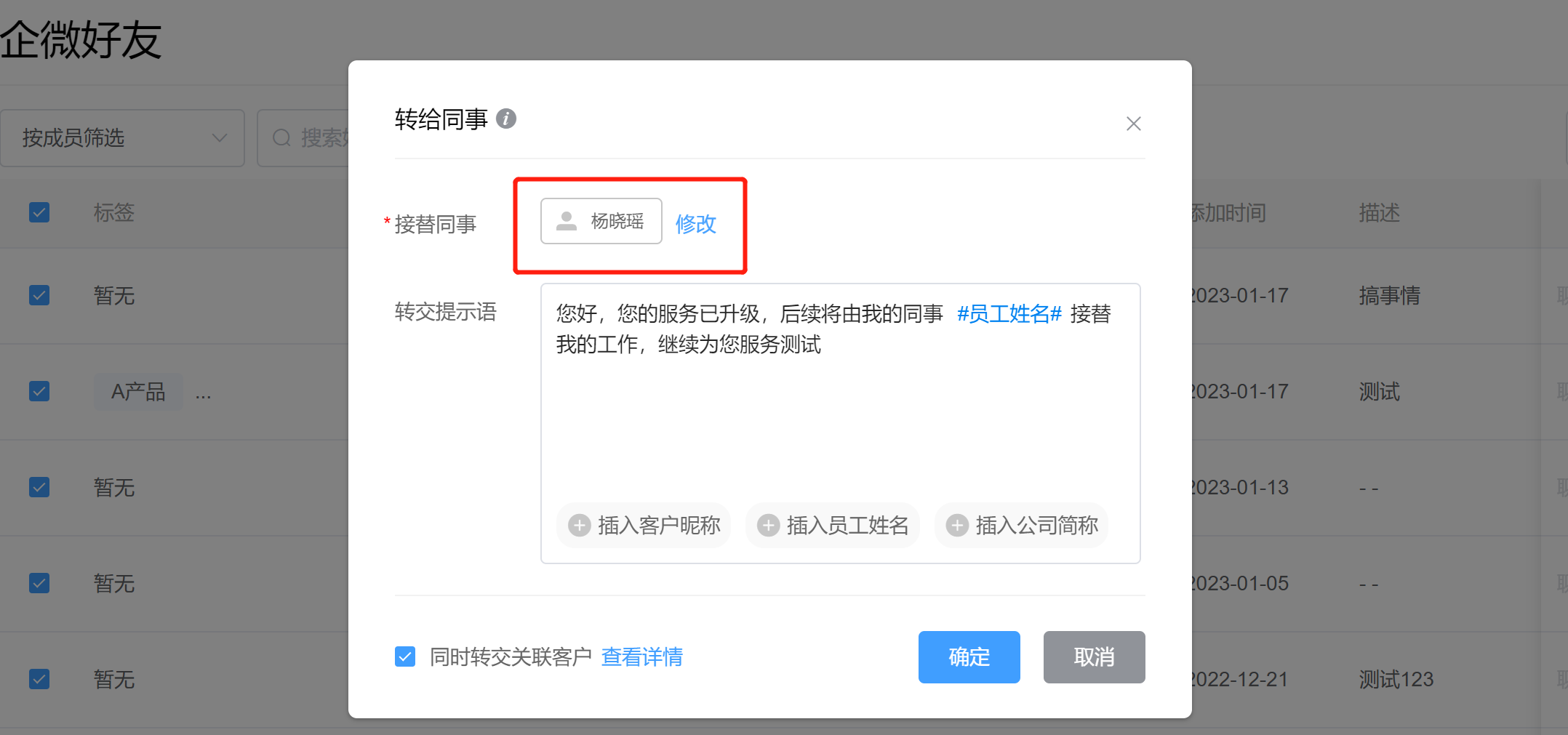 如果勾选了“同事转交关联客户”,还可以将客户资料一并转交给其他同事,高效完成客户跟进关系的承接。