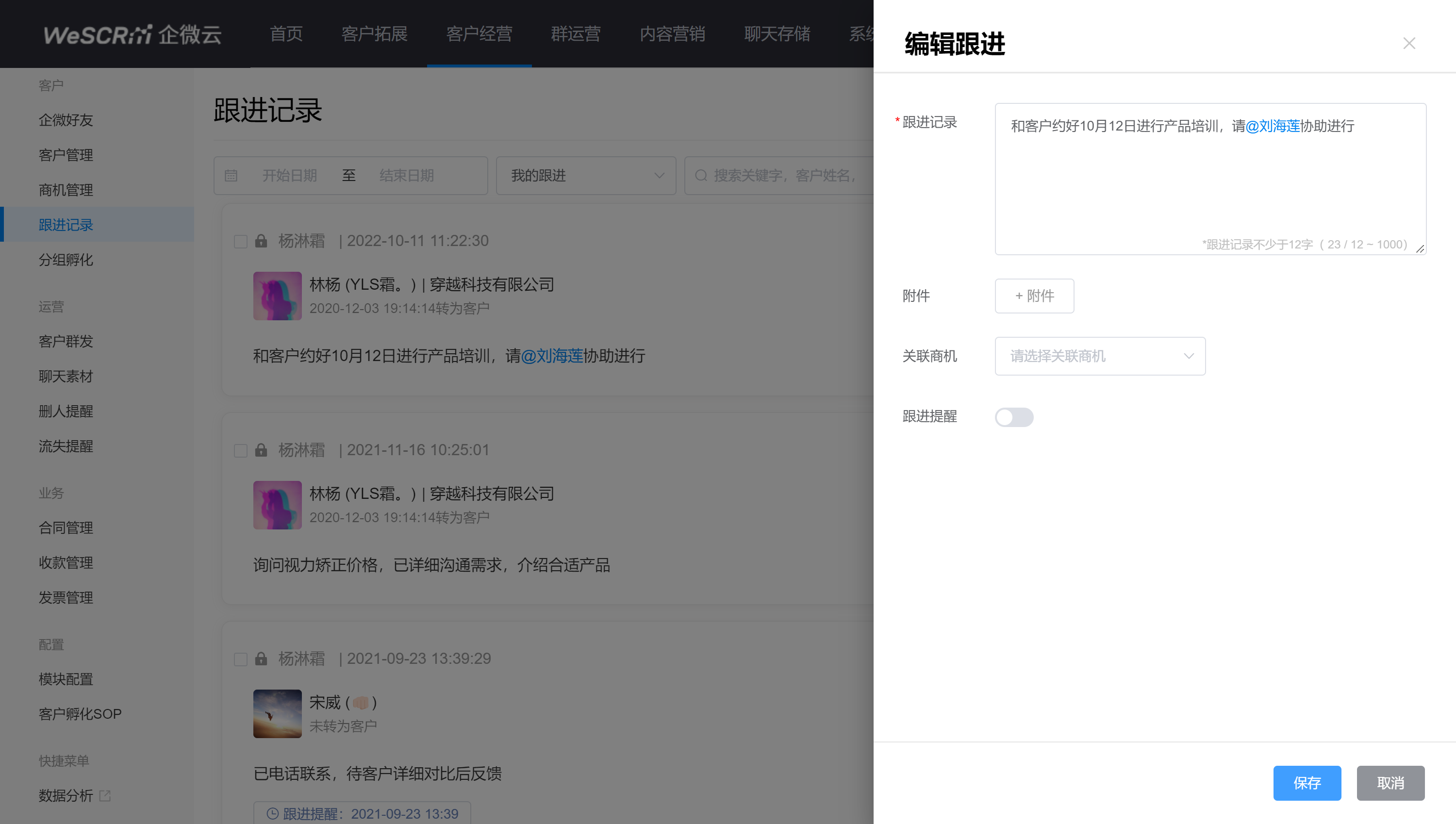 企微云后台:在【客户经营】-【客户】-【跟进记录】,即可填写该客户的跟进记录。