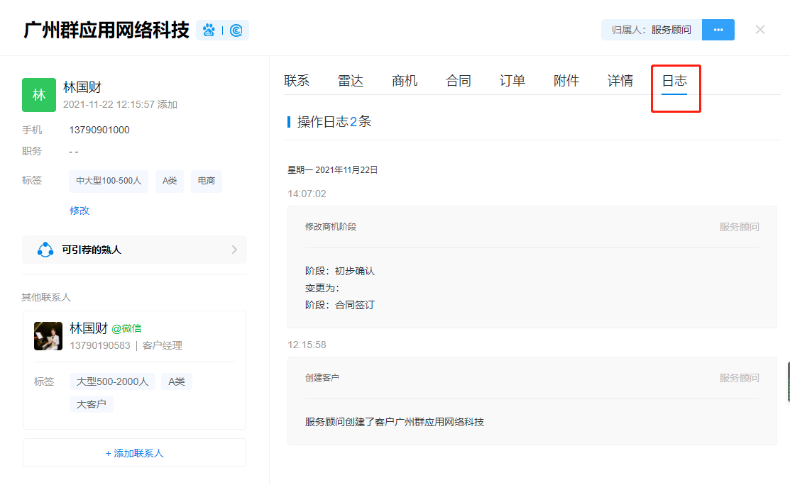 在【日志】板块,销售人员可以通过查看企业成员对该名客户历史上的所有操作日志,帮助销售人员快速梳理客户画像,了解对客户的跟进节奏,更好为客户跟进制定完善的跟进规划。