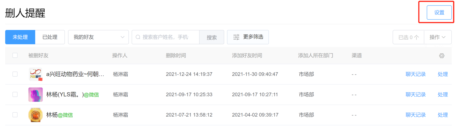 点击右上角【设置】,即可开启删人提醒,根据企业具体情况选择消息通知管理员及通知频率。当成员删除客户时,系统会推送提醒给管理员。