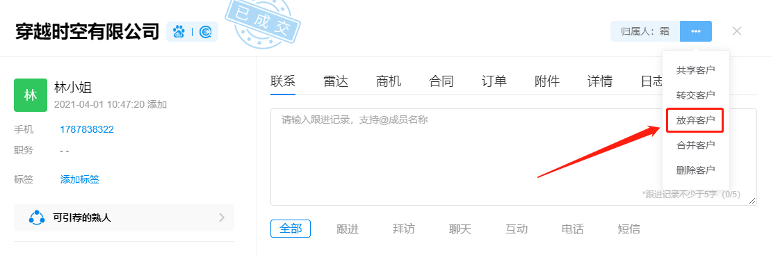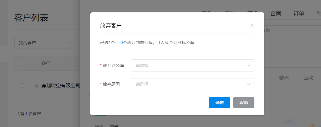 放弃客户时,可选择放弃客户原因。