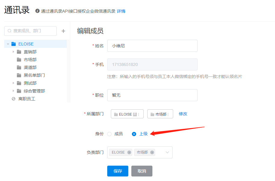 上级:通讯录中的成员被标记为上级后,可以在SCRM中查看所在部门成员的客户数据,同一成员若是多个部门的上级,则可以相应的查看多个部门的客户数据。