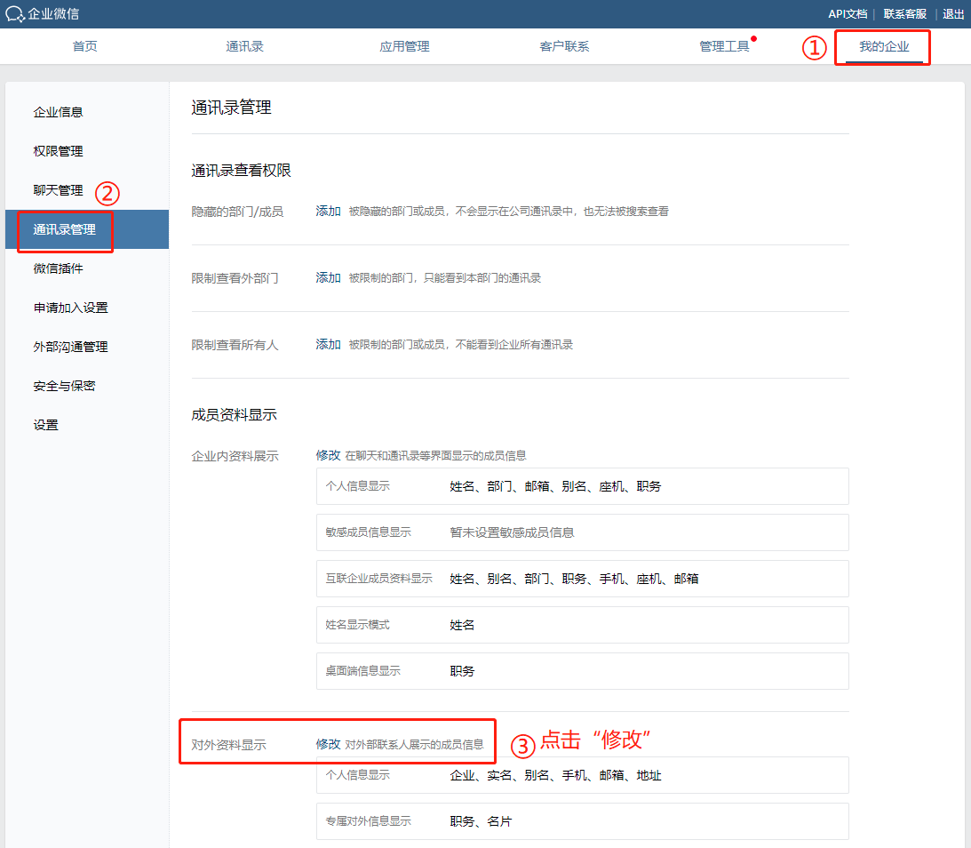 2、在企业微信管理后台,点击【我的企业】-【通讯录管理】-【对外资料显示】,点击修改