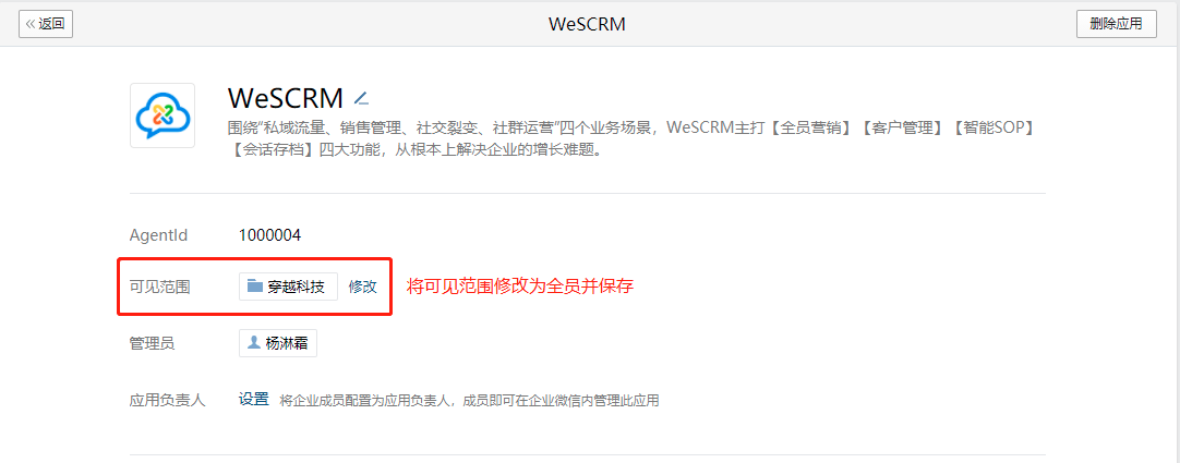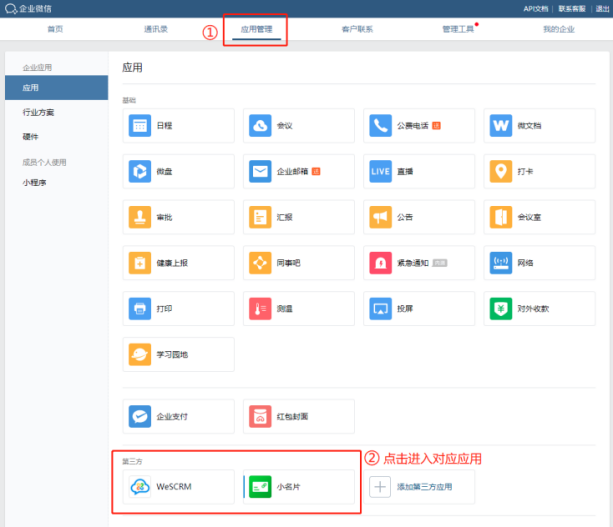 1、管理员登录企业微信管理后台,点击【应用管理】-第三方,分别点击进入WeSCRM、小名片,将“可见范围”修改为全员