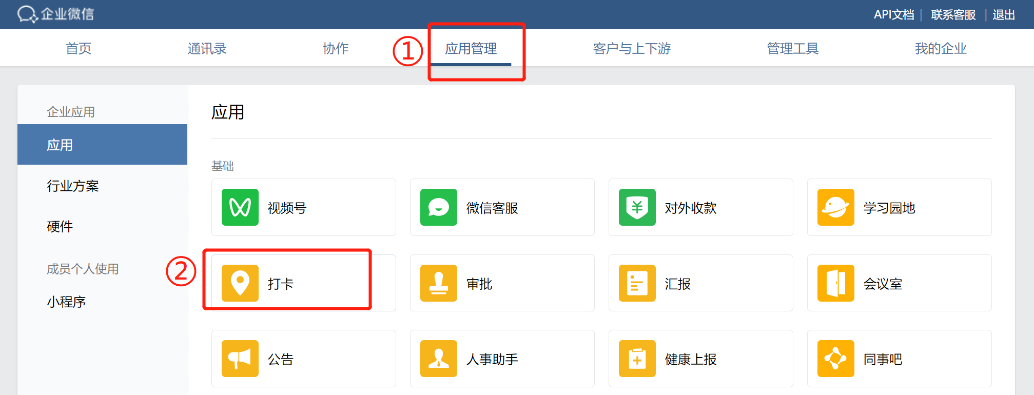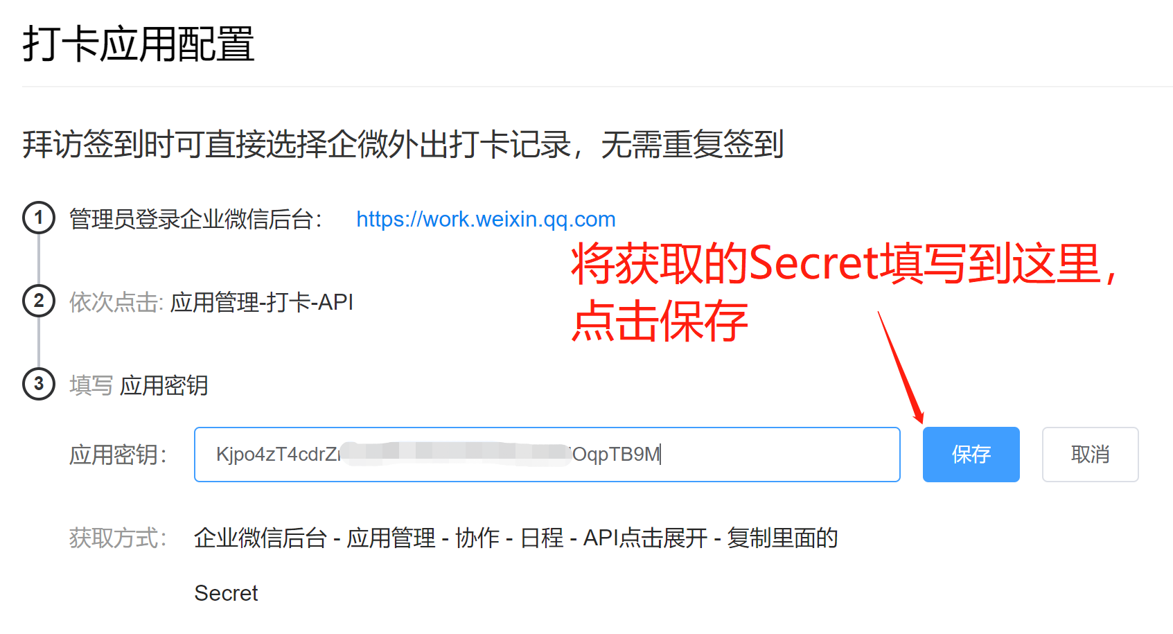 ②管理员登录企业微信管理后台,点击【应用管理】-【打卡】-【API】,将获取的Secret复制粘贴到企微云后台