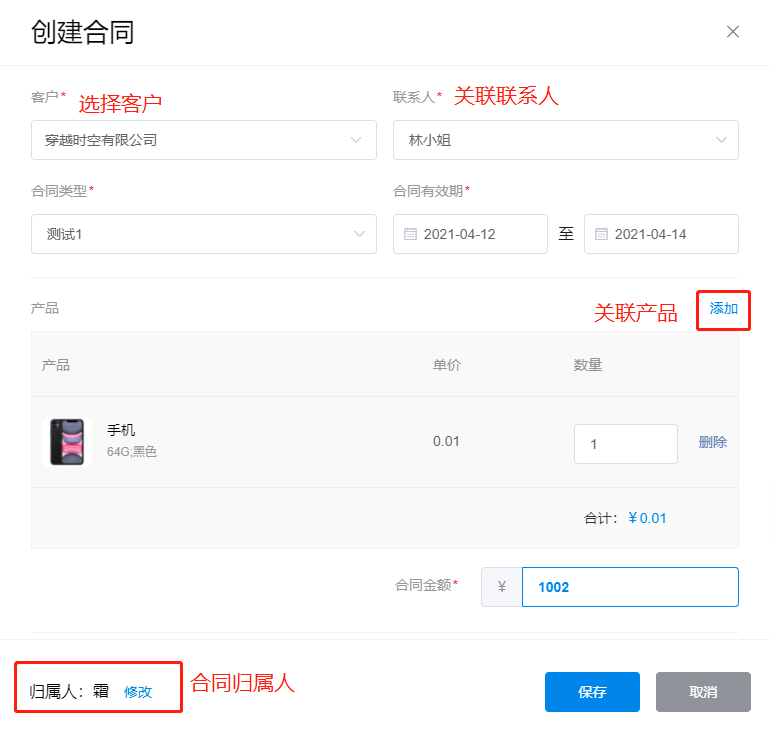 在【合同管理】模块,点击新建合同,销售人员即可关联客户及产品创建合同。