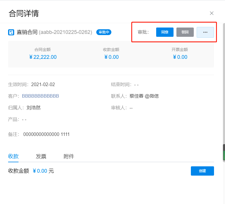 合同创建完成后,合同审核人会在企业微信接收到审批消息通知,可点击合同详情查看并进行审批。