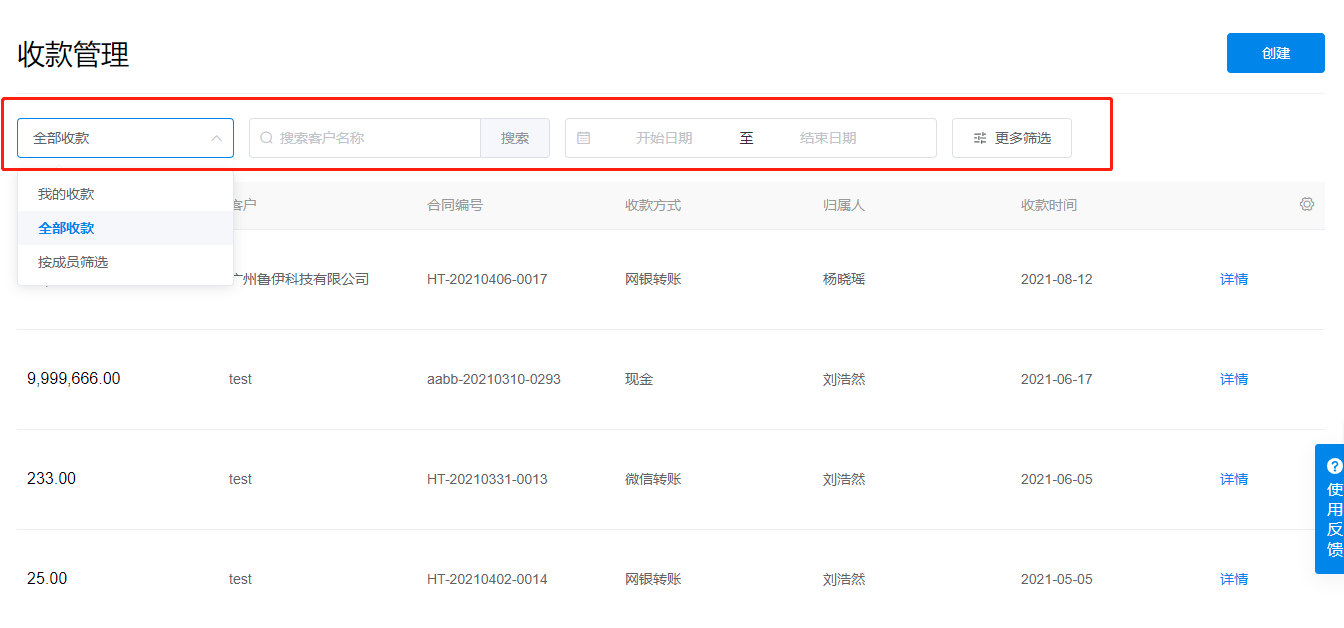 销售人员可在后台新建收款,收款关联客户、合同、联系人等信息,保证信息一致。收款时间到期自动提醒,推送业务人员及时跟进回款。