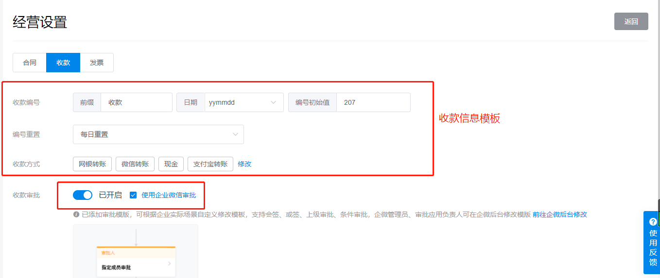企微云收款审批可与企业微信打通,调用企业微信审批流。管理员可登陆企业微信管理后台设置好审批流程,然后在企微云开启。