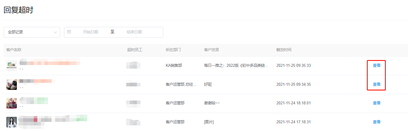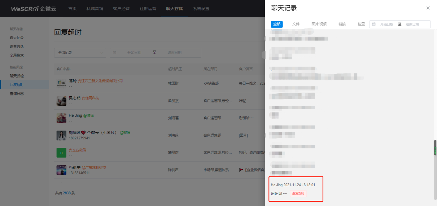 有无及时回复、积极对接客户,对保障客户服务质量极其重要。如果长时间不回复客户,可能会造成成交机会流失。以前企业管理者无从得知,现在如果成员长时间未回复客户、触发规则,管理员就能接收到回复超时提醒,掌握客户服务情况。
