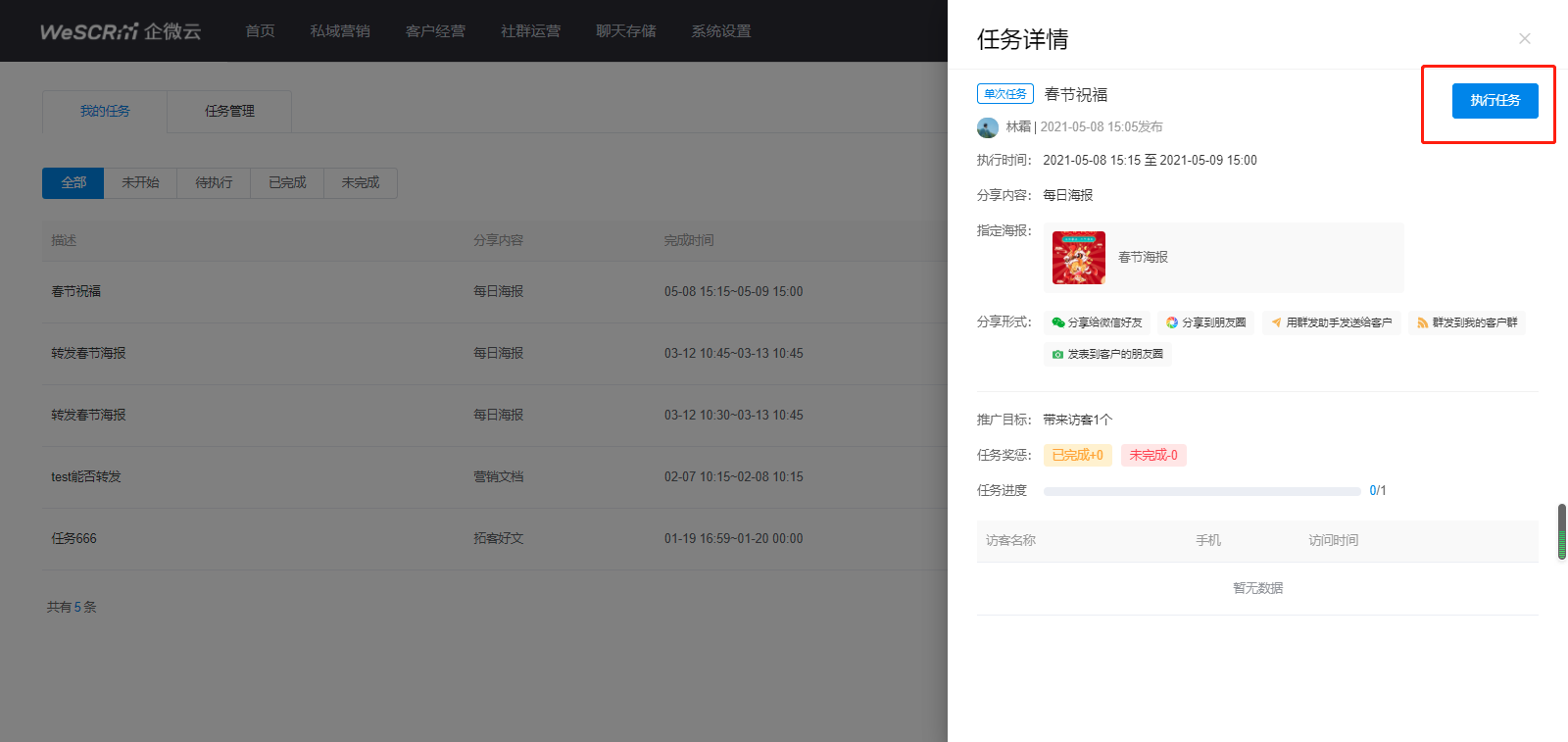 点击查看任务详情,可看到任务介绍、分享内容、推广目标、任务奖惩、带来访客等内容,点击【执行任务】,扫码后即可执行。