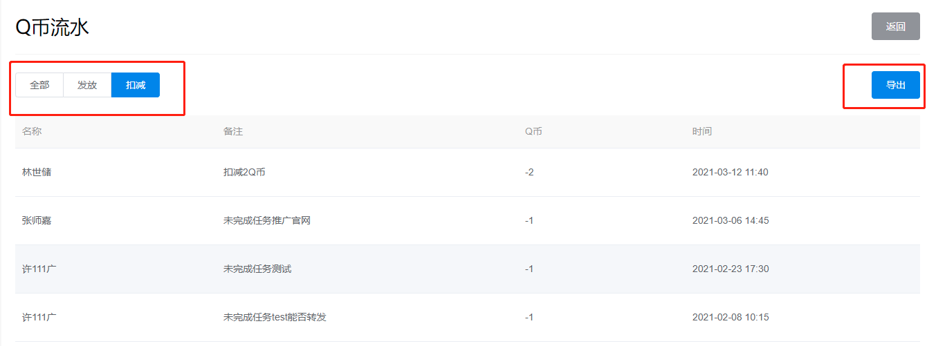 点击【Q币流水】,可查看企业发放/扣减的所有记录,并支持将数据导出。