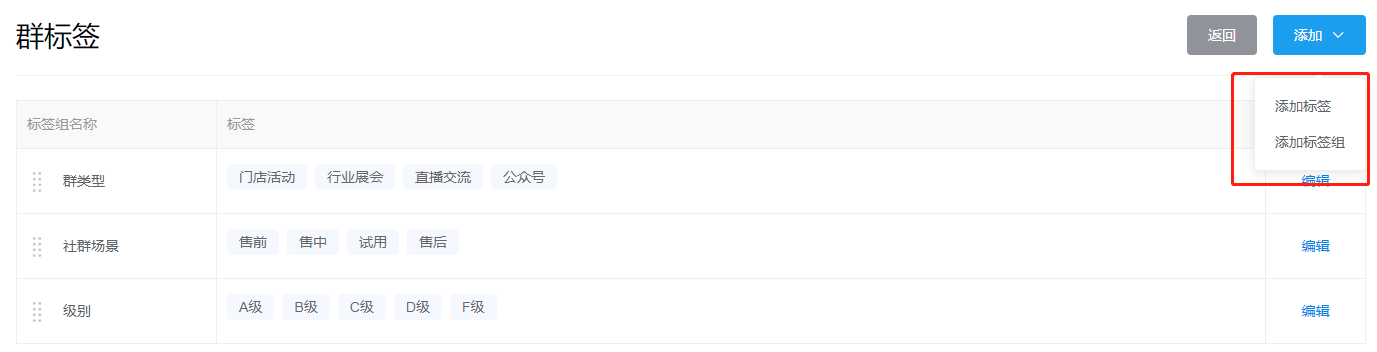 操作路径:WeSCRM企微云后台-群运营-配置-群标签