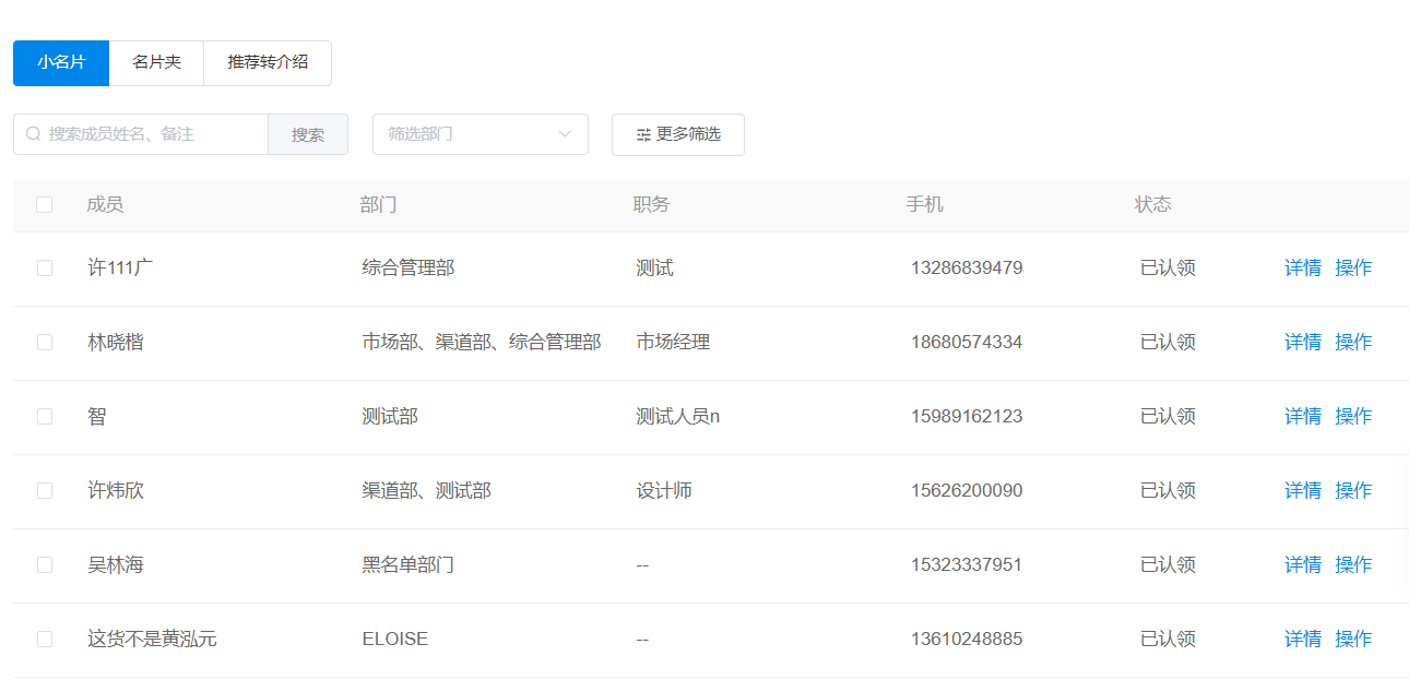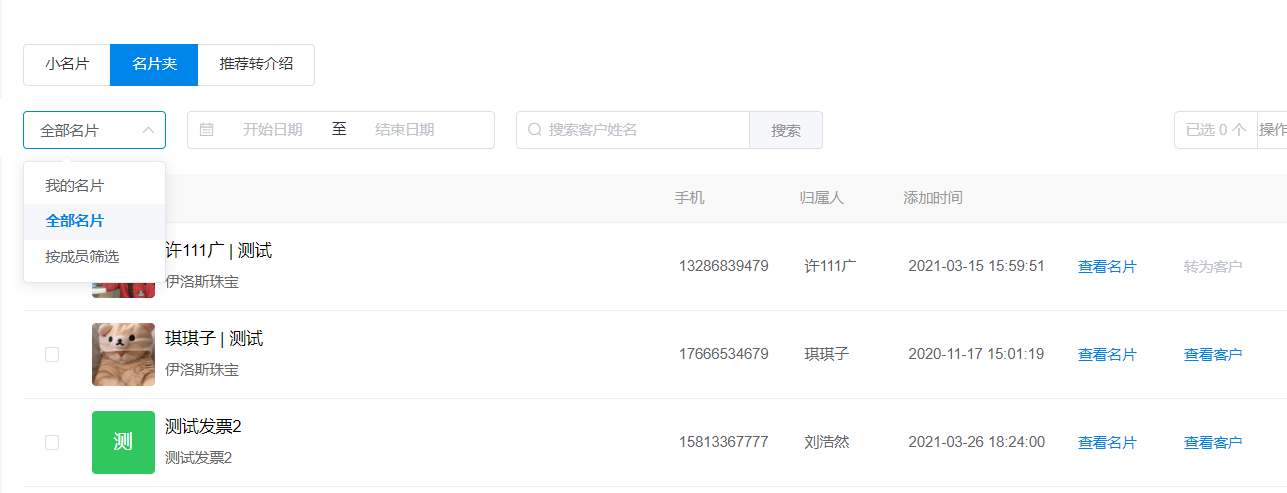 【名片夹】可查看成员名片收藏下的所有客户名片列表,支持一键转入SCRM跟进,查看跟进情况;