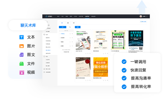 企微管家提供的聊天术库和聊天资料库支持支持标签分组和快捷检索,内容支持:文本、图片、图文、文件、视频等多种类型的聊天素材,以及红包、抽奖、优惠券等促单工具。销售在聊天窗口可以一键调用。在与客户沟通过程中快速回复客户的重复性问题,如价格、产品特点、优惠活动、售后服务等,免去繁杂的复制粘贴操作。也可以在客户有购买意向时使用促单工具快速促成业务,极大的提高沟通效率及客户转化率