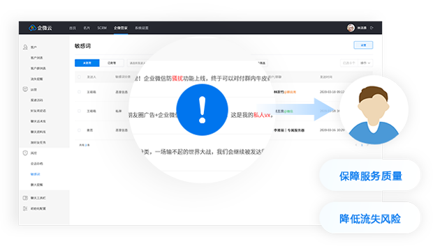 基于企业微信会话存档功能,通过企微管家即可实现永久存储销售与客户的微信聊天记录。在监控员工与客户沟通过程中的敏感词及敏感行为时,可实时将违规行为及违规信息推送给预设的管理员,保障服务的质量及客户服务体验。企微管家风控系统还能实时监控“员工被客户删除”、“员工主动删除客户”等敏感行为降低客户流失风险