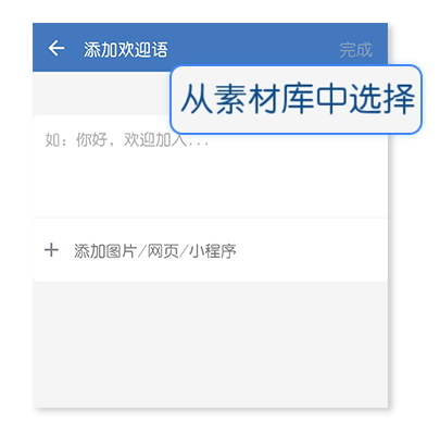 管理员添加了素材后,群主可以进入入群欢迎语设置页面,点击从素材库中选择,直接将管理员设置好的入群欢迎语配置到群聊中使用。