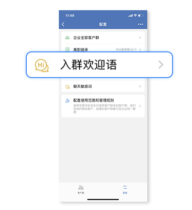 管理员可在企业微信手机端,点击【工作台】-【客户群】-【配置】,进入【入群欢迎语】,添加欢迎语。管理员最多可以添加20条入群欢迎语素材供员工使用。